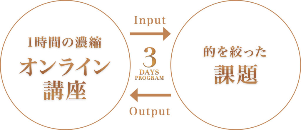 3日間集中プログラムでは、1時間の濃縮オンライン講座と的を絞った課題で、3日間を振り返れば進化プランが完成しているという設計になっています。