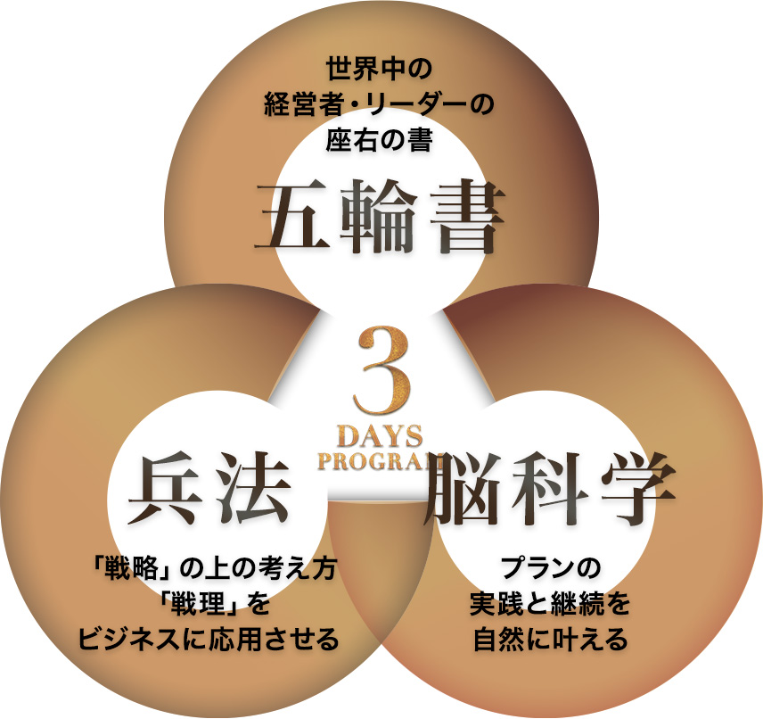 本プログラム最大の特徴は、「五輪書」+「兵法」+「脳科学」の3方向からのアプローチにあります。