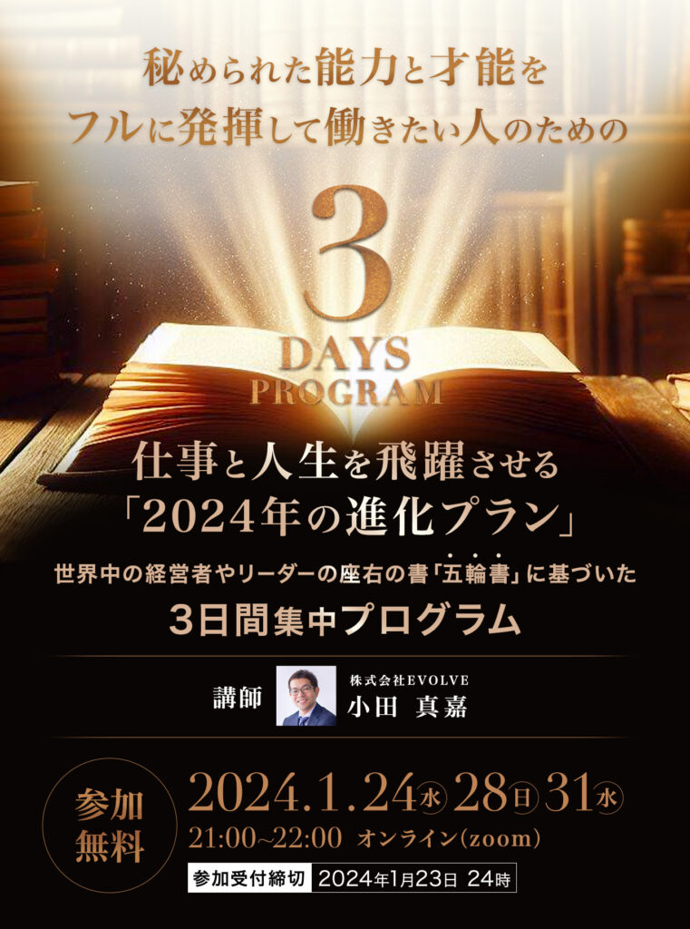 『「2024年の進化プラン」をつくる3日間集中プログラム』最大の特徴は、「五輪書」+「兵法」+「脳科学」の3つのアプローチから、自分の脳・ビジネス(働き方)・人生を進化させるプランを楽しみながら作り、希望を持って2024年を迎えることです。